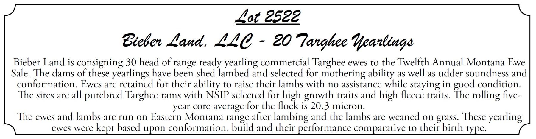Bieber Land is consigning 30 head of range ready yearling commercial Targhee ewes to the Twelfth Annual Montana Ewe Sale. The dams of these yearlings have been shed lambed and selected for mothering ability as well as udder soundness and conformation. Ewes are retained for their ability to raise their lambs with no assistance while staying in good condition. The sires are all purebred Targhee rams with NSIP selected for high growth traits and high fleece traits. The rolling five-year core average for the flock is 20.3 micron.