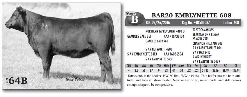 • Tattoo 608 is the looker. BW 80 lbs., WW 645 lbs. This heifer has the hair, attitude,