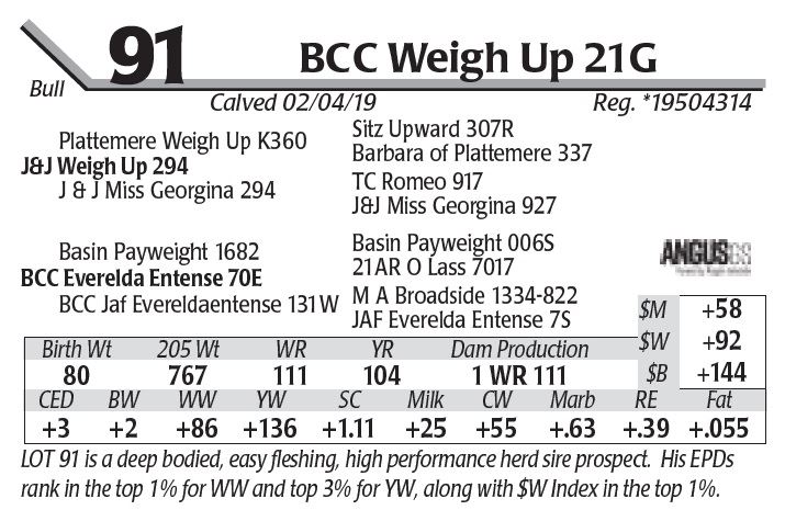 LOT 91 is a deep bodied, easy fleshing, high performance herd sire prospect. His EPDs