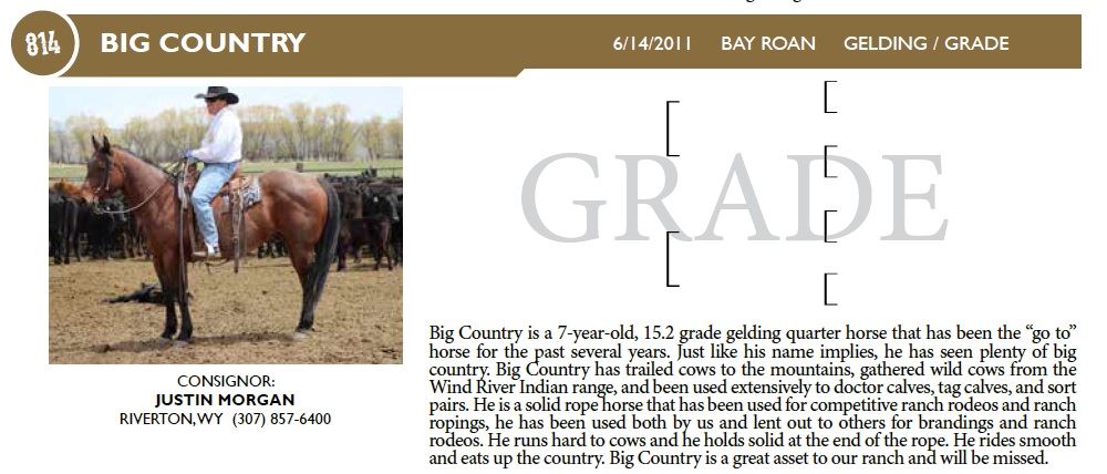 Big Country is a 7-year-old, 15.2 grade gelding quarter horse that has been the "go to" horse for the past several years. Just like his name implies, he has seen plenty of big country. Big Country has trailed cows to the mountains, gathered wild cows from the Wind River Indian range, and been used extensively to doctor calves, tag calves, and sort pairs. He is a solid rope horse that has been used for competitive ranch rodeos and ranch ropings, he has been used both by us and lent out to others for brandings and ranch rodeos. He runs hard to cows and he holds solid at the end of the rope. He rides smooth and eats up the country. Big Country is a great asset to our ranch and will be missed.