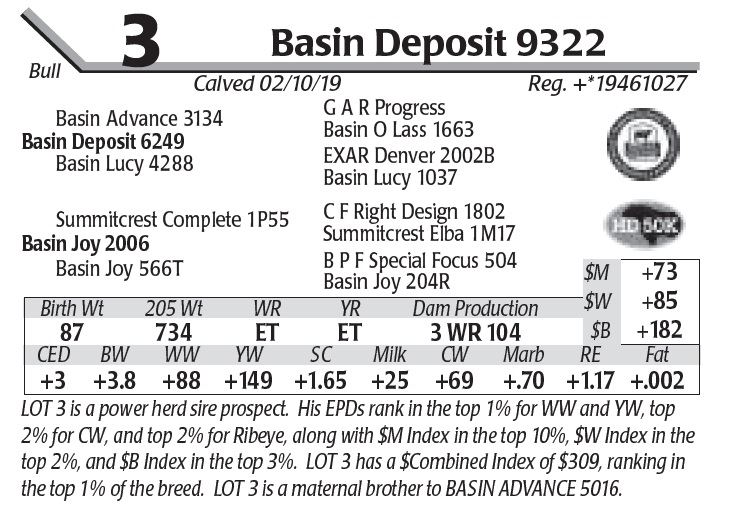 the top 1% of the breed. LOT 3 is a maternal brother to BASIN ADVANCE 5016.