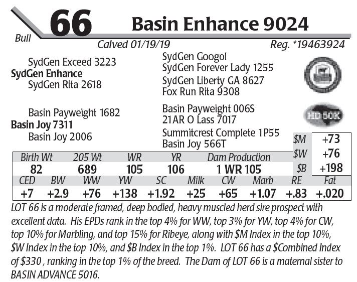 LOT 66 is a moderate framed, deep bodied, heavy muscled herd sire prospect with