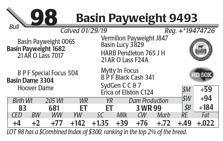 LOT 98 has a $Combined Index of $300, ranking in the top 2% of the breed.