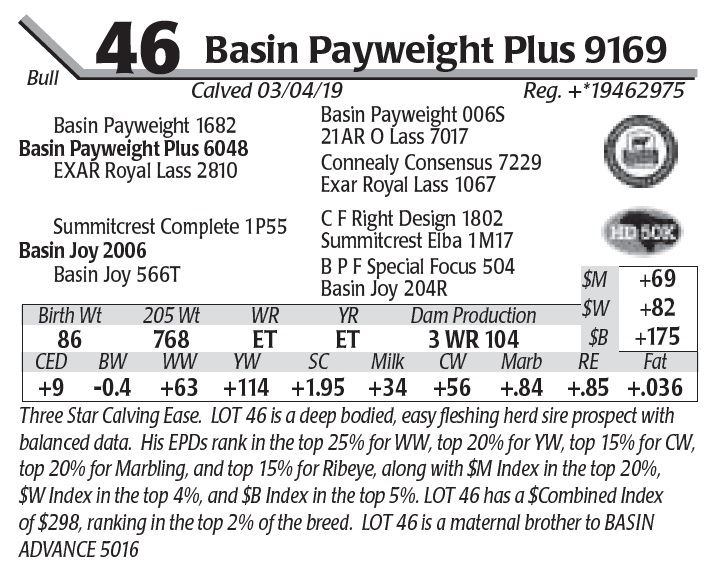 Three Star Calving Ease. LOT 46 is a deep bodied, easy fleshing herd sire prospect with