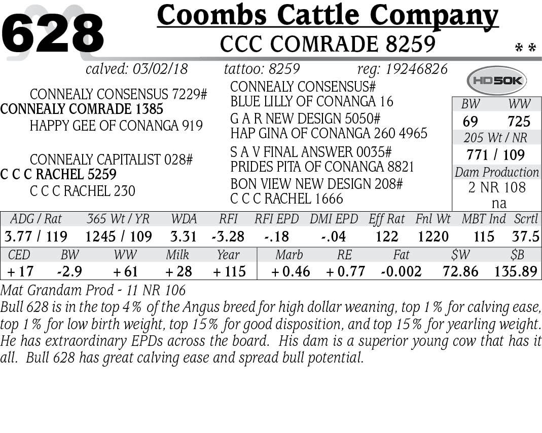 Bull 628 is in the top 4% of the Angus breed for high dollar weaning, top 1% for calving ease,