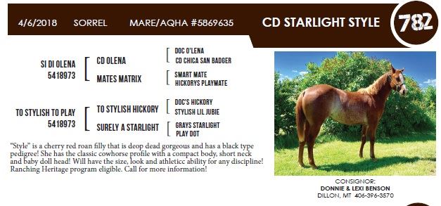 “Style” is a cherry red roan filly that is deop dead gorgeous and has a black type pedigree! She has the classic cowhorse profile with a compact body, short neck and baby doll head! Will have the size, look and athleticc ability for any discipline! Ranching Heritage program eligible. Call for more information!