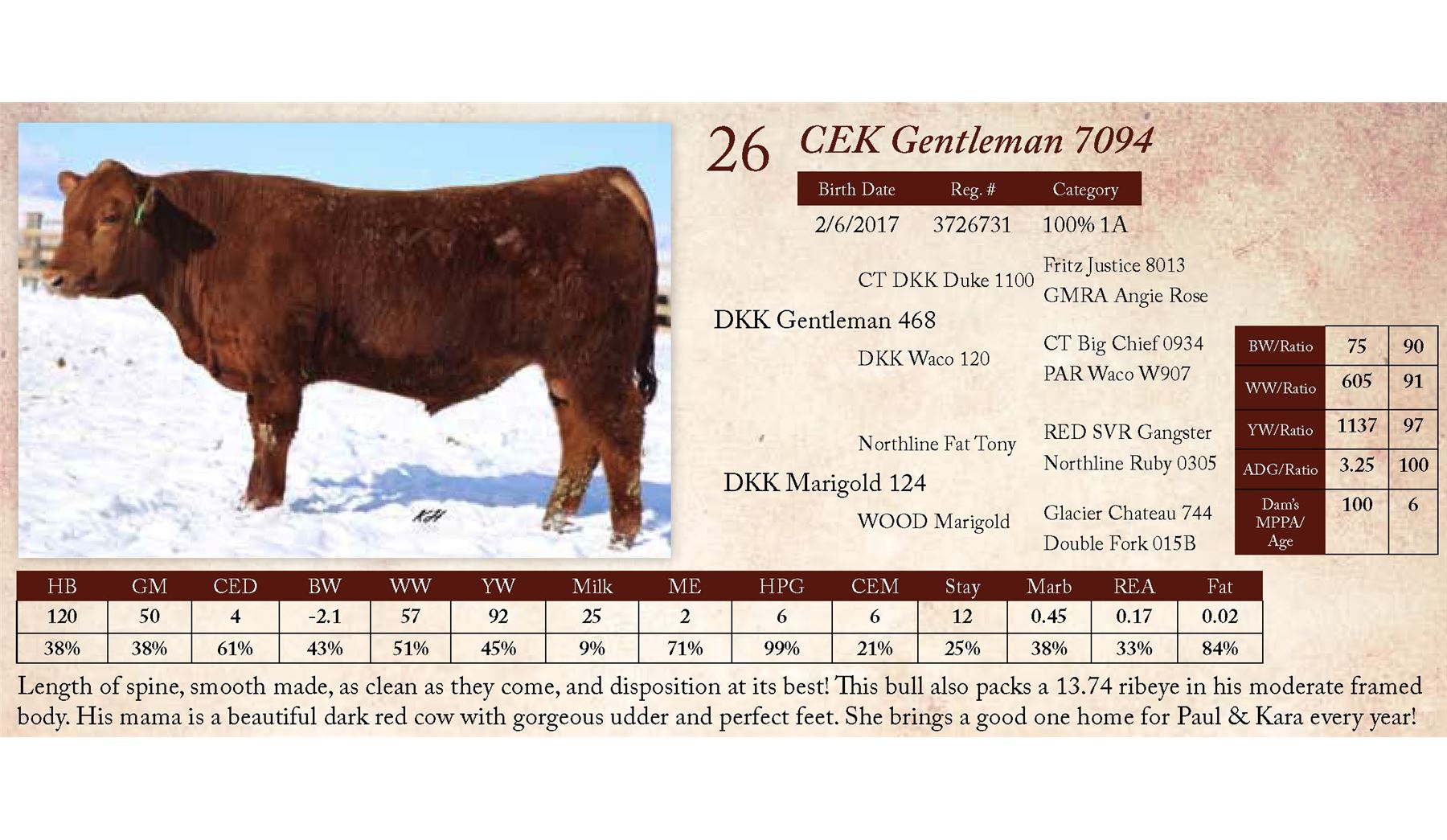 Length of spine, smooth made, as clean as they come, and disposition at its best! This bull also packs a 13.74 ribeye in his moderate framed