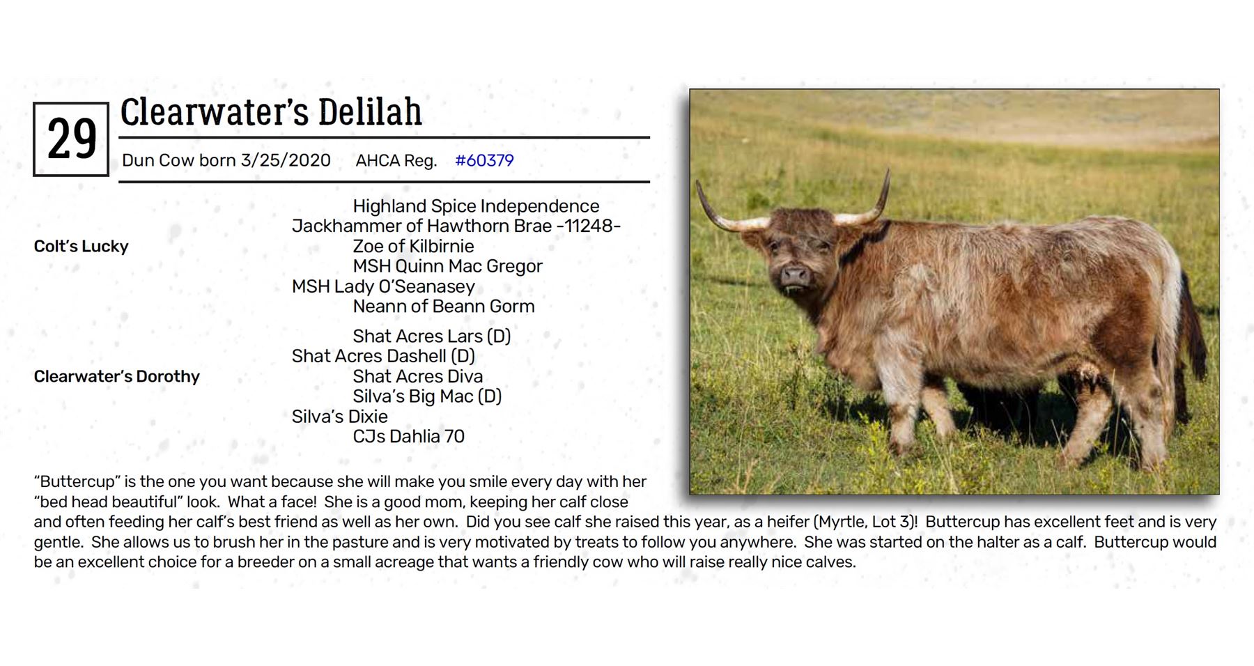 gentle. She allows us to brush her in the pasture and is very motivated by treats to follow you anywhere. She was started on the halter as a calf. Buttercup would