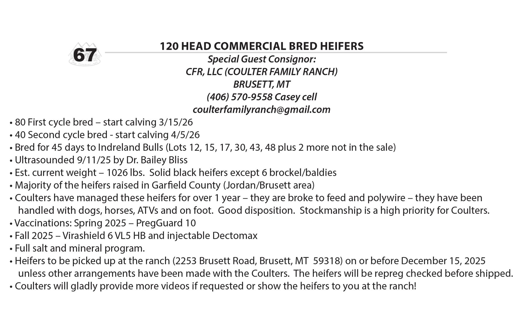 • Heifers to be picked up at the ranch (2253 Brusett Road, Brusett, MT 59318) on or before December 15, 2025