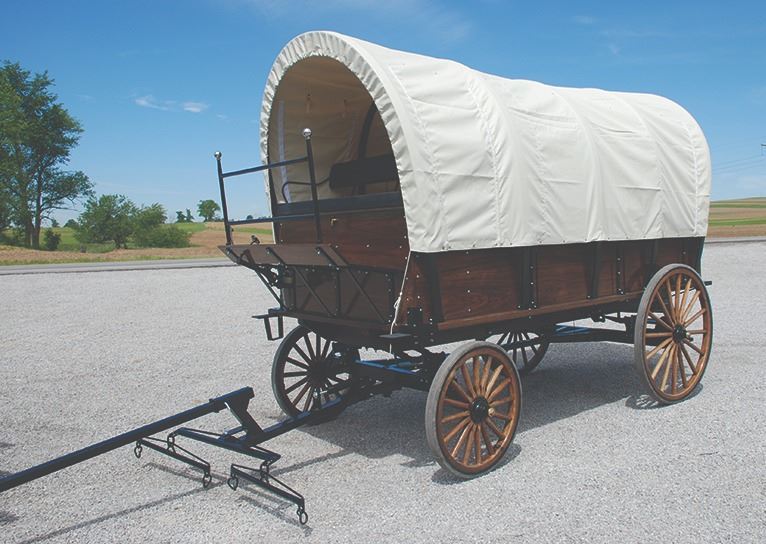 Covered Wagon, built on Pioneer Equipment running gear, leaf springs and hydraulic brakes, cushions on all seats, BRAND NEW!