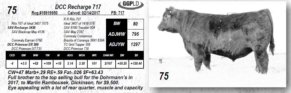 Full brother to the top selling bull for the Dohrmann’s in 2017, to Marlin Rambousek, Dickinson, for $9,500.