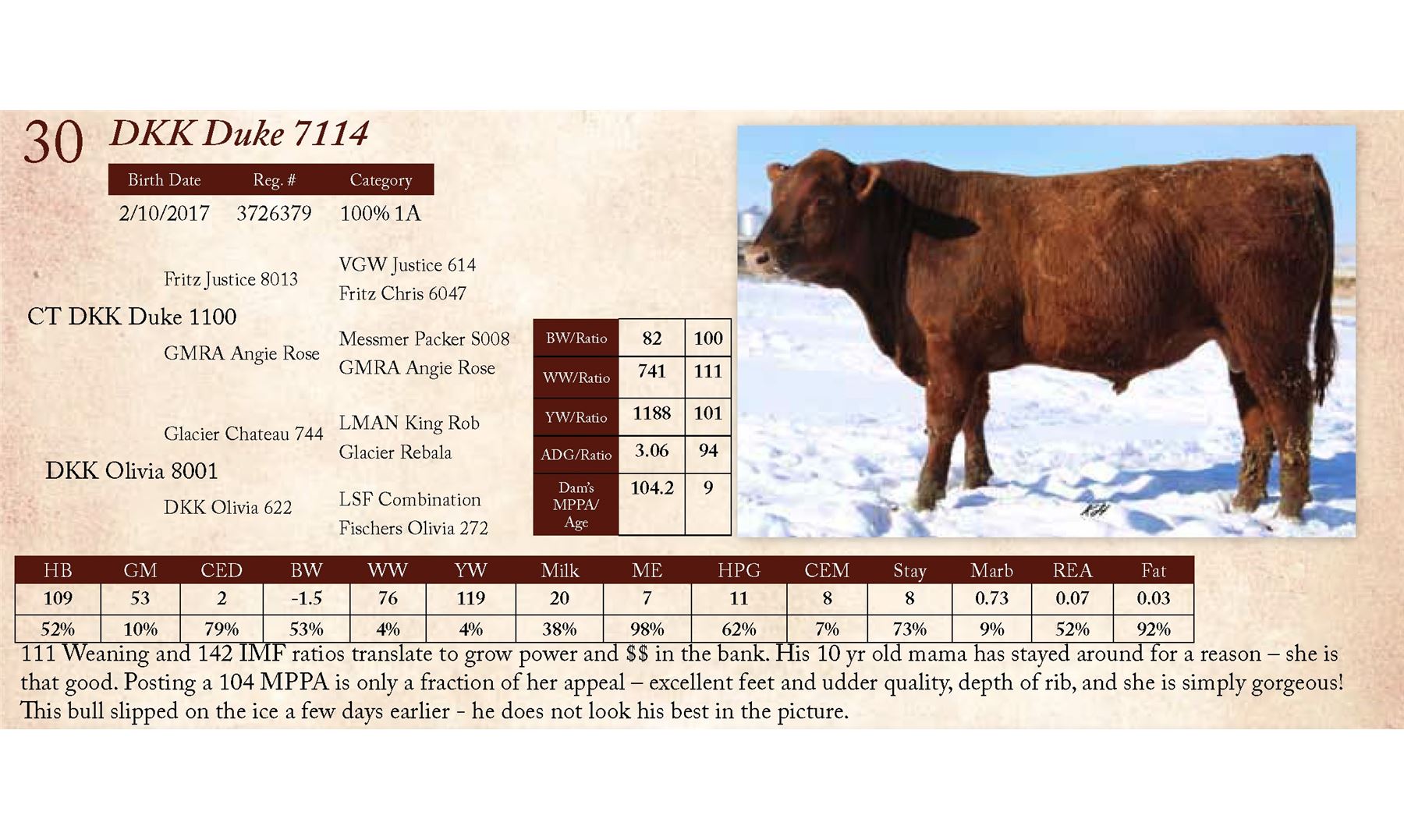 111 Weaning and 142 IMF ratios translate to grow power and $$ in the bank. His 10 yr old mama has stayed around for a reason – she is