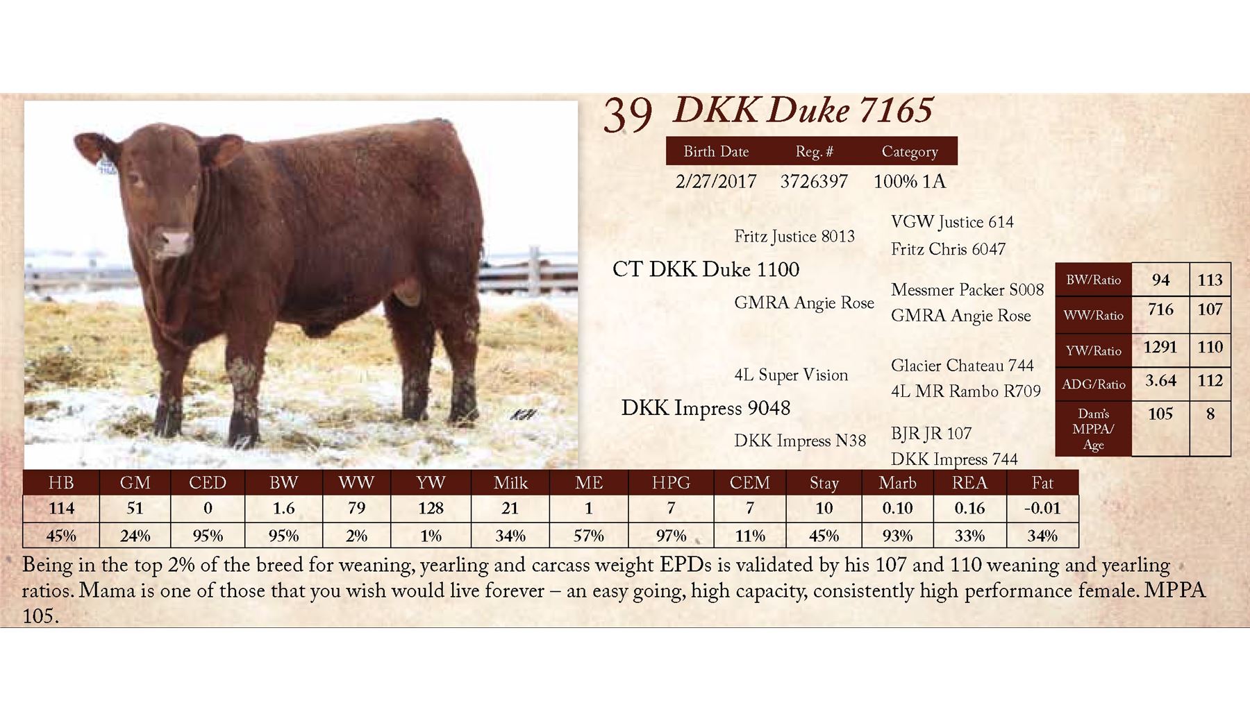 Being in the top 2% of the breed for weaning, yearling and carcass weight EPDs is validated by his 107 and 110 weaning and yearling