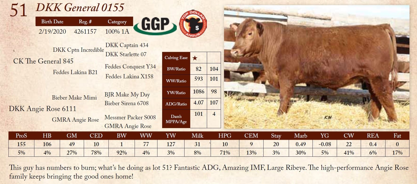 This guy has numbers to burn; what’s he doing as lot 51? Fantastic ADG, Amazing IMF, Large Ribeye. The high-performance Angie Rose