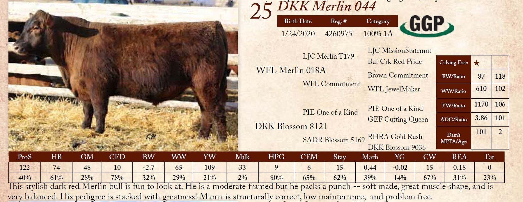 This stylish dark red Merlin bull is fun to look at. He is a moderate framed but he packs a punch -- soft made, great muscle shape, and is