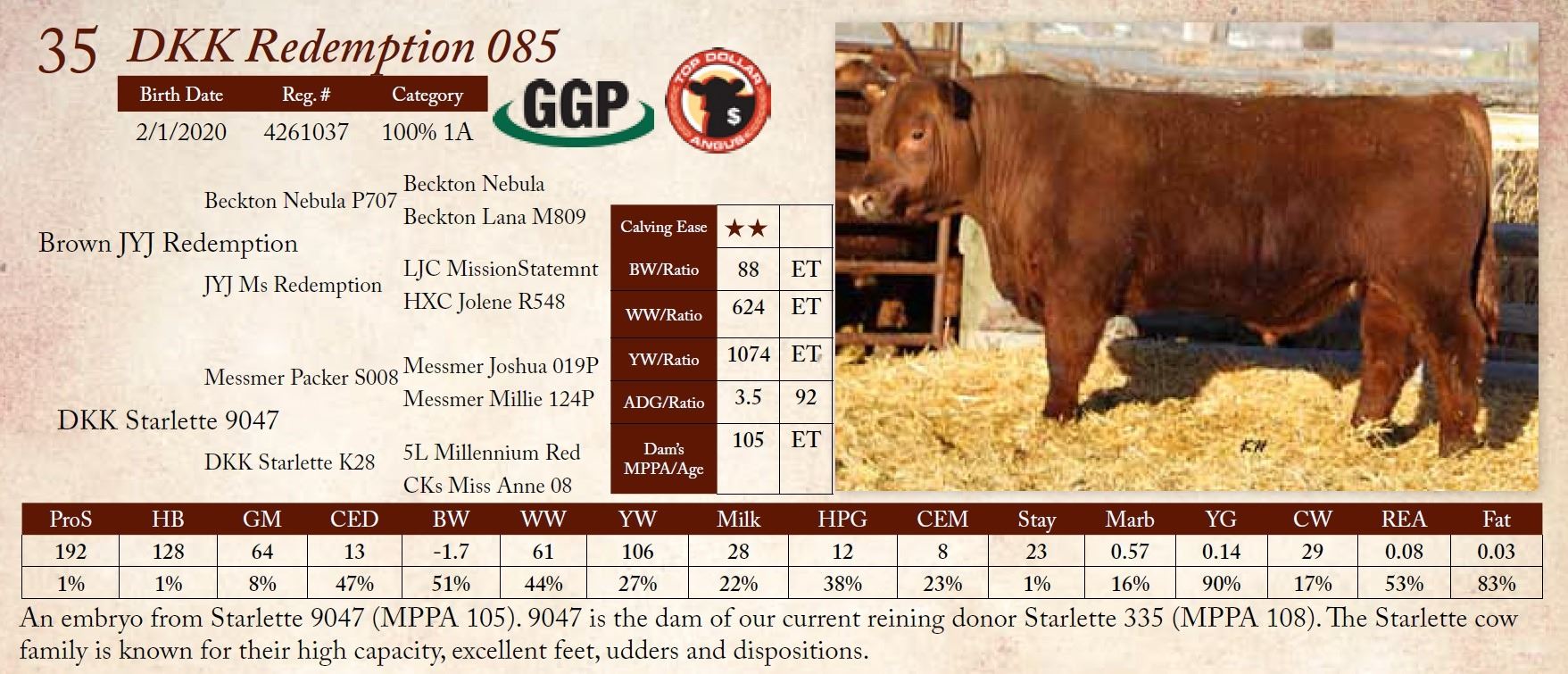 An embryo from Starlette 9047 (MPPA 105). 9047 is the dam of our current reining donor Starlette 335 (MPPA 108). The Starlette cow