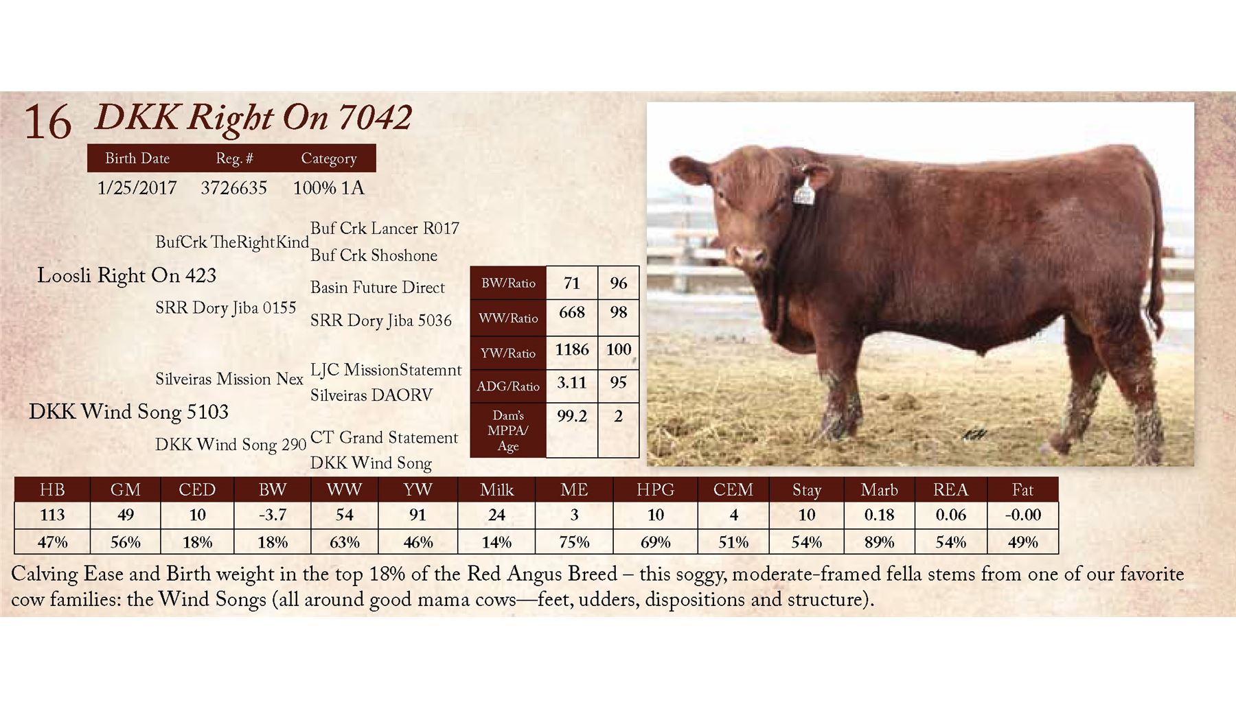 Calving Ease and Birth weight in the top 18% of the Red Angus Breed – this soggy, moderate-framed fella stems from one of our favorite