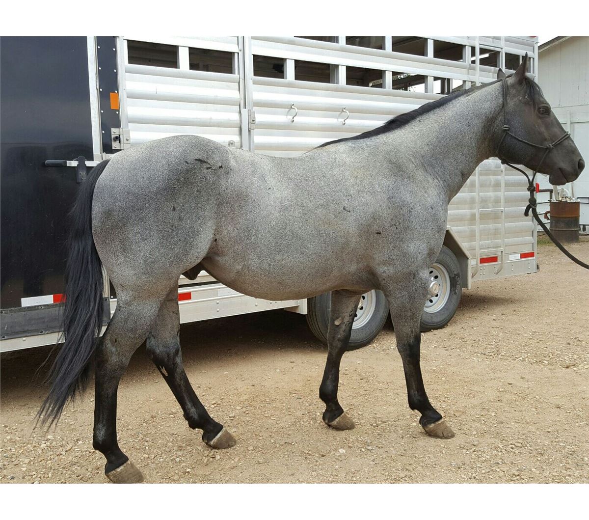 We used Pete for 2 breeding seasons. He has thrown 100% roan foals. He has been ridden on the ranch gathering and working in cramped quarters with other horses in the shipping corral. He performs like a gentleman around other horses and has also been ridden inside. He has the potential to make a great heel horse. He loves having a job and he watches a cow nicely. He has been 5 panel tested negative.