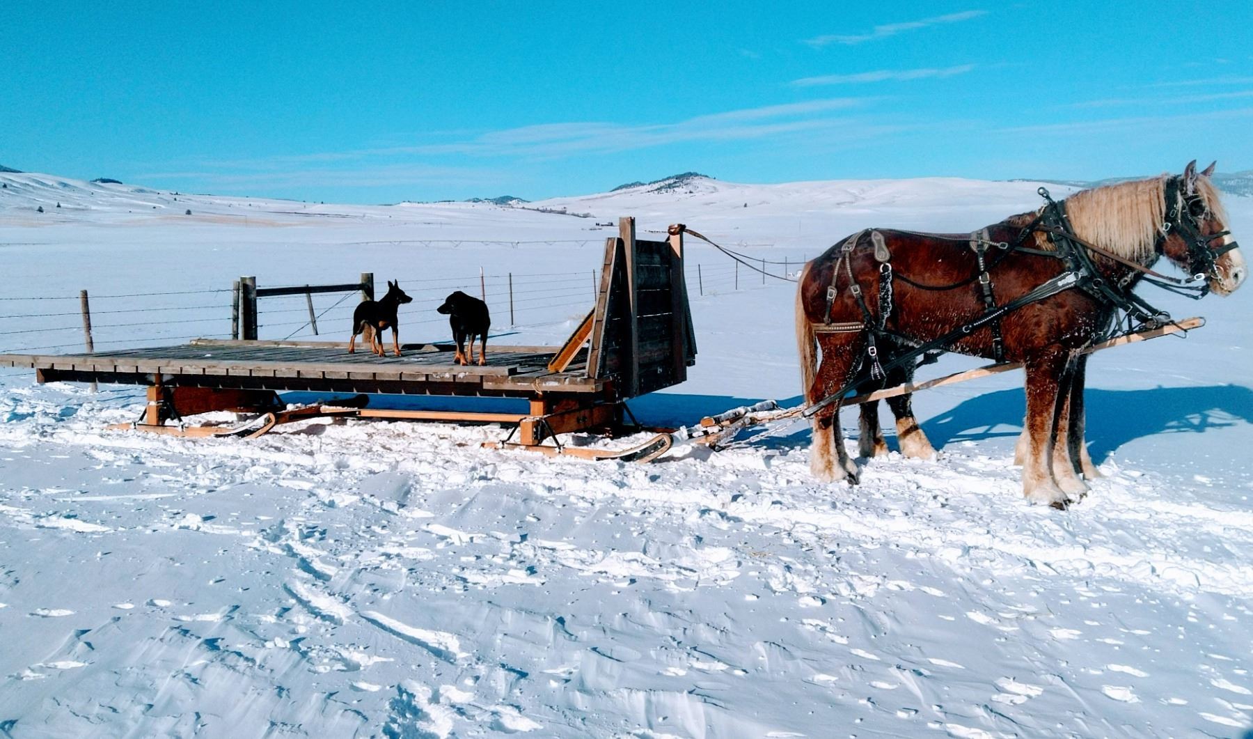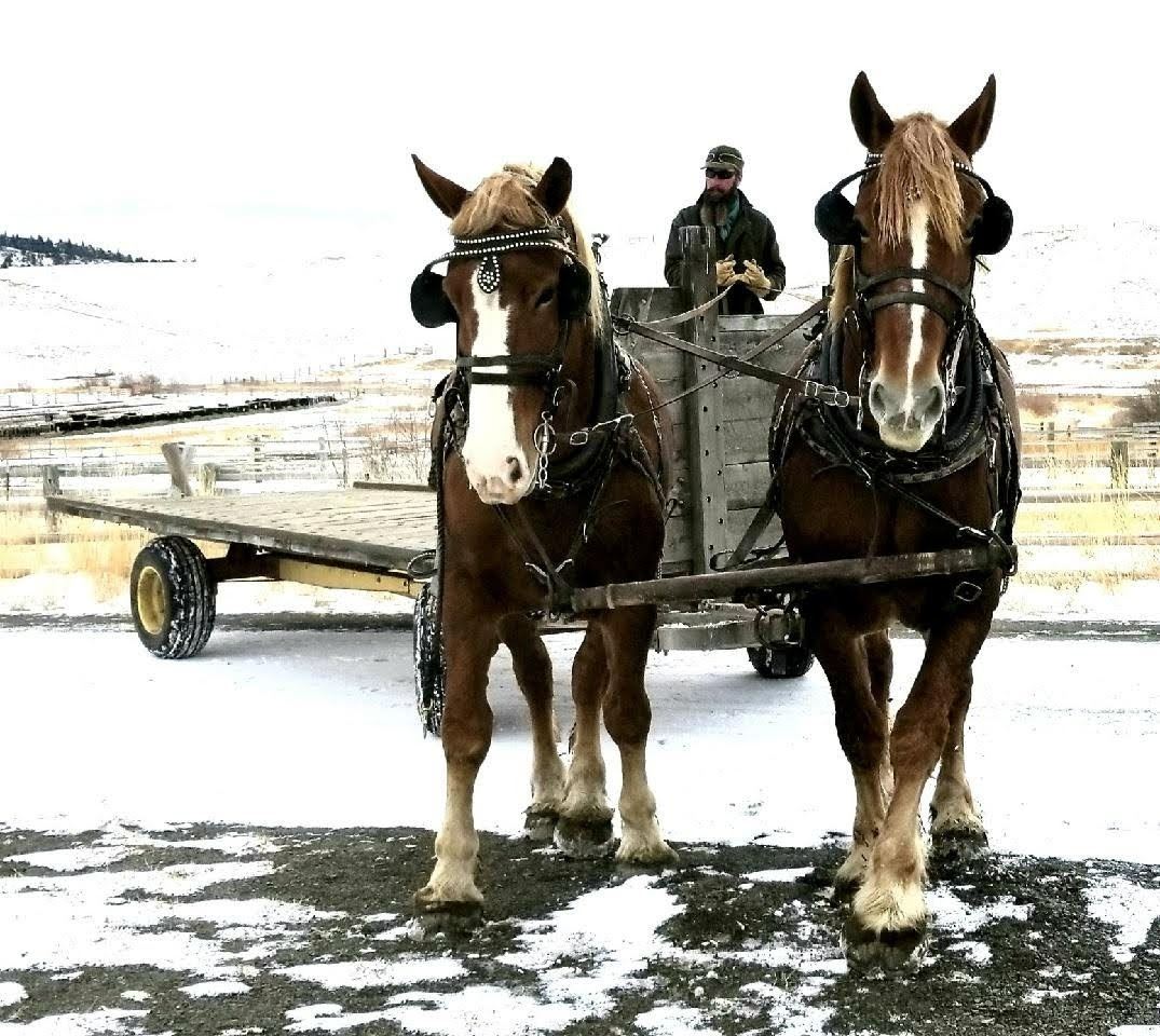 Duke and Doc have been my feed team for the last couple of winters. They have a good verbal whoa, when feeding you can just tie the lines and pitch hay as they walk. Long legged and fast walking they’ll really cover the ground and pull a heavy load. No balk, no quit, these boys just go. They’ve never had a runaway but they’re not a beginners team, they need to be driven not just sit on the wagon with slack lines. Previous owner used them at public events like corn shucking contests and plow days, but I haven’t had them out in public myself. They mouth at 12 and 13 years old. For more info call or text JD at 406 539-0404.