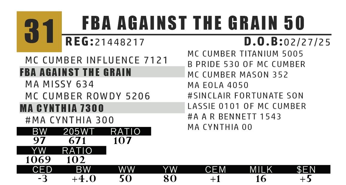 9 YEAR OLD DAM WITH A WEANING RATIO OF 105. LOT 31 IS A RELIABLE