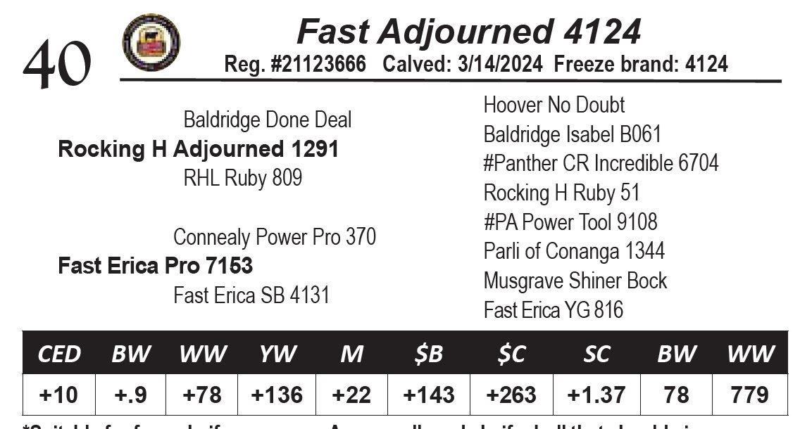 Suitable for frame heifers or cows. A very well-made heifer bull that should give you a worry free calving season.*His dam is a good milking daughter of our great materal and calving ease sire, Power Pro.*His Carcass EPDs: Marb: +.87, RE: +.43. His WR: 100, Dam’s WR: 6/104.