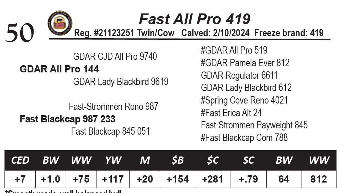 Smooth made, well-balanced bull.*His dam is a first calf heifer, is double bred for our elite maternal cow , Fast Erica Alt 24.*His Carcass EPDs: Marb: +.69, RE: +.75. His WR: 107, Dam’s WR: 1/107.