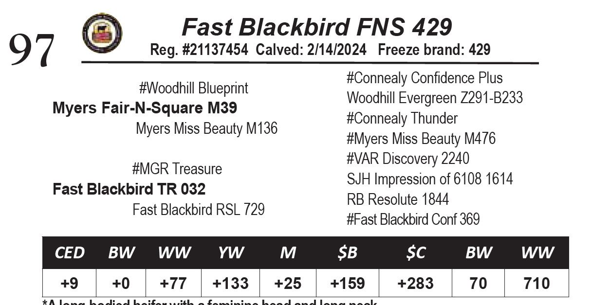 A long-bodied heifer with a feminine head and long neck.*Dam is moderate frame, easy to handle Treasure daughter and her grand mother is a Pathfinder cow still in production at 12-years-old.*Her WR: 101, Dam’s WR: 3/104.