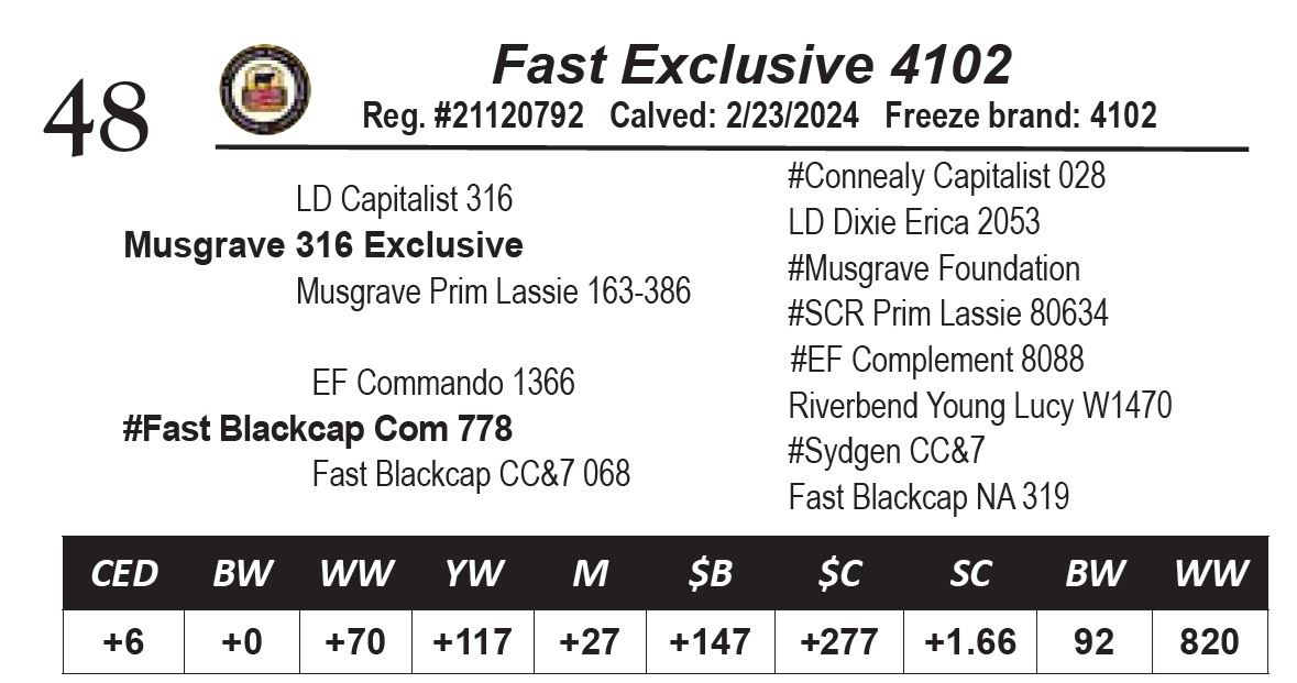 An easy fleshing, soft made bull with tremendous length of body. Good feet and legs as well.*His dam is a deep bodied, easy fleshing Pathfinder cow with a sound, well-made udder.*His Carcass EPDs: Marb: +.86, RE: +.68. His WR: 108, Dam’s WR: 6/107.