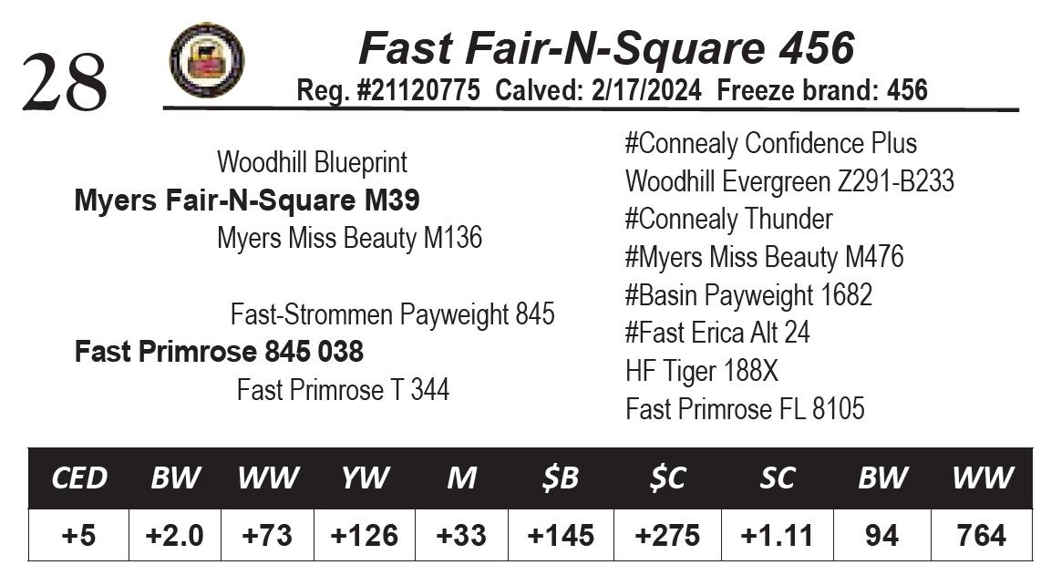 Lots 26, 27, and 28 are 3/4 brothers and all have deep, thick, stout phenotypes; put these brothers together for a super uniform calf crop!*His dam is another highly productive daughter of Fast-Strommen Payweight 845.*His Carcass EPDs: Marb: +.84, RE: +.49. His WR: 101. Dam's WR: 2/108.