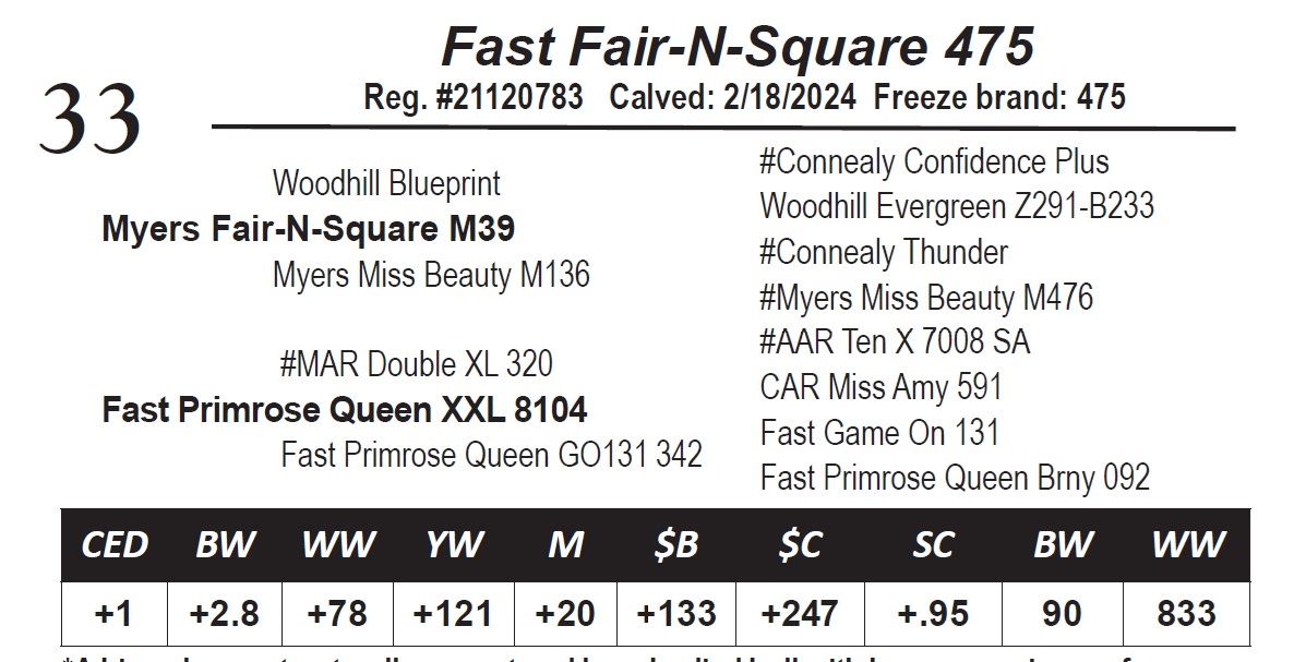 A big volume, structurally correct and long-bodied bull with heavy weaning performance.*His dam is a long, deep bodied XXL daughter. *His Carcass EPDs: Marb: +.74, RE: +.58. His WR: 110. Dam’s WR: 4/97.