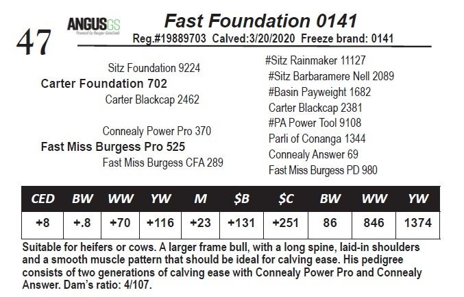Suitable for heifers or cows. A larger frame bull, with a long spine, laid-in shoulders and a smooth muscle pattern that should be ideal for calving ease. His pedigree consists of two generations of calving ease with Connealy Power Pro and Connealy Answer. Dam’s ratio: 4/107.