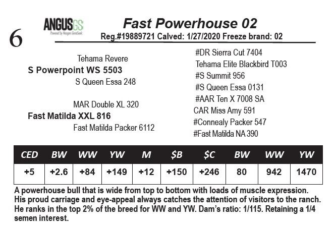 A powerhouse bull that is wide from top to bottom with loads of muscle expression. His proud carriage and eye-appeal always catches the attention of visitors to the ranch. He ranks in the top 2% of the breed for WW and YW. Dam’s ratio: 1/115. Retaining a 1/4 semen interest.