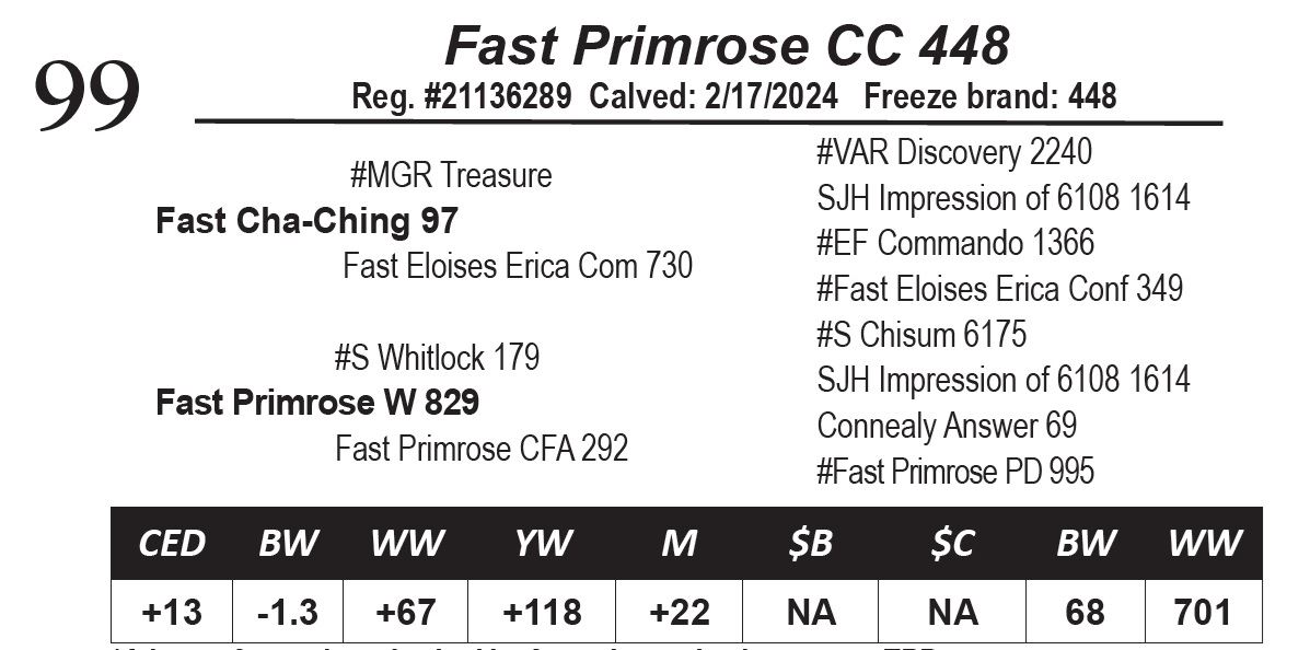 A larger frame, long-bodied heifer with good calving ease EPDs.*Her dam is a thick, deep bodied cow.*Her WR: 100, Dam’s WR: 5/97.