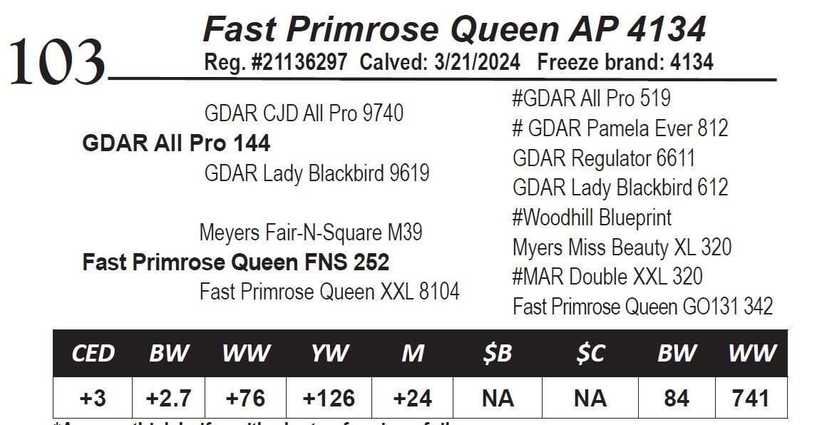 A super thick heifer with plenty of spring of rib.*Her dam is a first-calf heifer and a full sister to Lot 33.*Her WR: 107, Dam’s WR: 1/107.