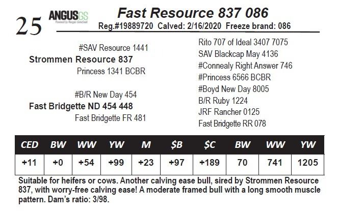 Suitable for heifers or cows. Another calving ease bull, sired by Strommen Resource 837, with worry-free calving ease! A moderate framed bull with a long smooth muscle pattern. Dam’s ratio: 3/98.