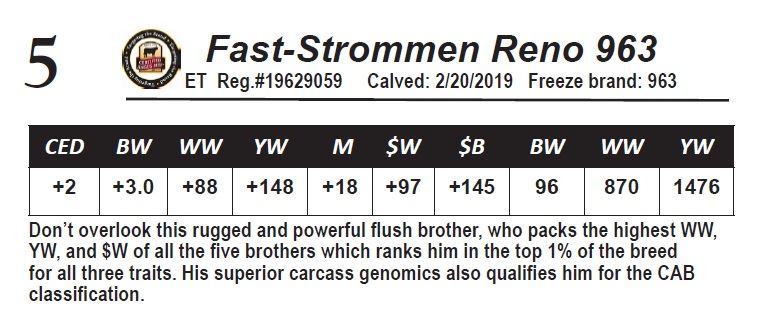 Don’t overlook this rugged and powerful flush brother, who packs the highest WW, YW, and $W of all the five brothers which ranks him in the top 1% of the breed for all three traits. His superior carcass genomics also qualifies him for the CAB classification.