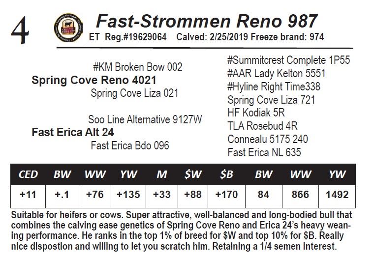 Suitable for heifers or cows. Super attractive, well-balanced and long-bodied bull that combines the calving ease genetics of Spring Cove Reno and Erica 24’s heavy weaning performance. He ranks in the top 1% of breed for $W and top 10% for $B. Really nice dispostion and willing to let you scratch him. Retaining a 1/4 semen interest.