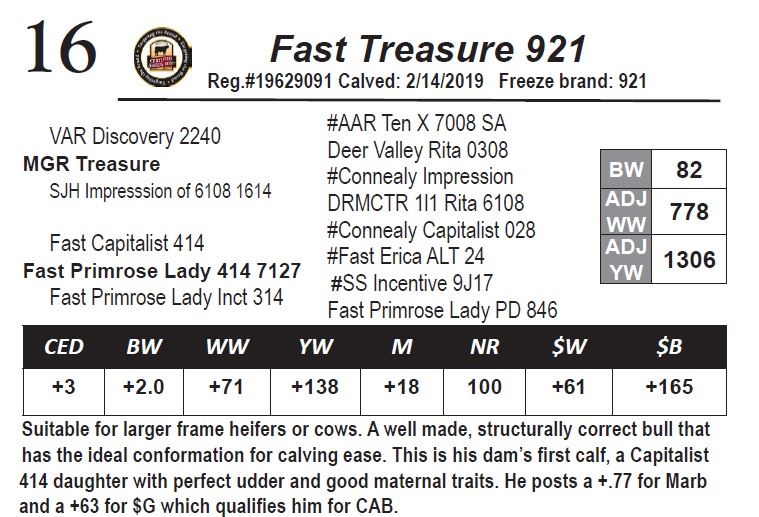 Suitable for larger frame heifers or cows. A well made, structurally correct bull that has the ideal conformation for calving ease. This is his dam’s first calf, a Capitalist 414 daughter with perfect udder and good maternal traits. He posts a +.77 for Marb and a +63 for $G which qualifies him for CAB.