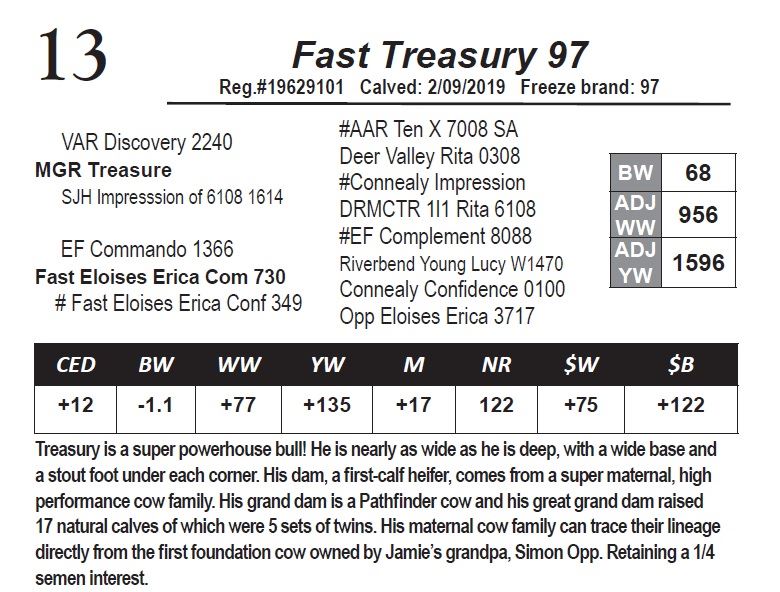 Treasury is a super powerhouse bull! He is nearly as wide as he is deep, with a wide base and a stout foot under each corner. His dam, a first-calf heifer, comes from a super maternal, high performance cow family. His grand dam is a Pathfinder cow and his great grand dam raised 17 natural calves of which were 5 sets of twins. His maternal cow family can trace their lineage directly from the first foundation cow owned by Jamie’s grandpa, Simon Opp. Retaining a 1/4 semen interest.