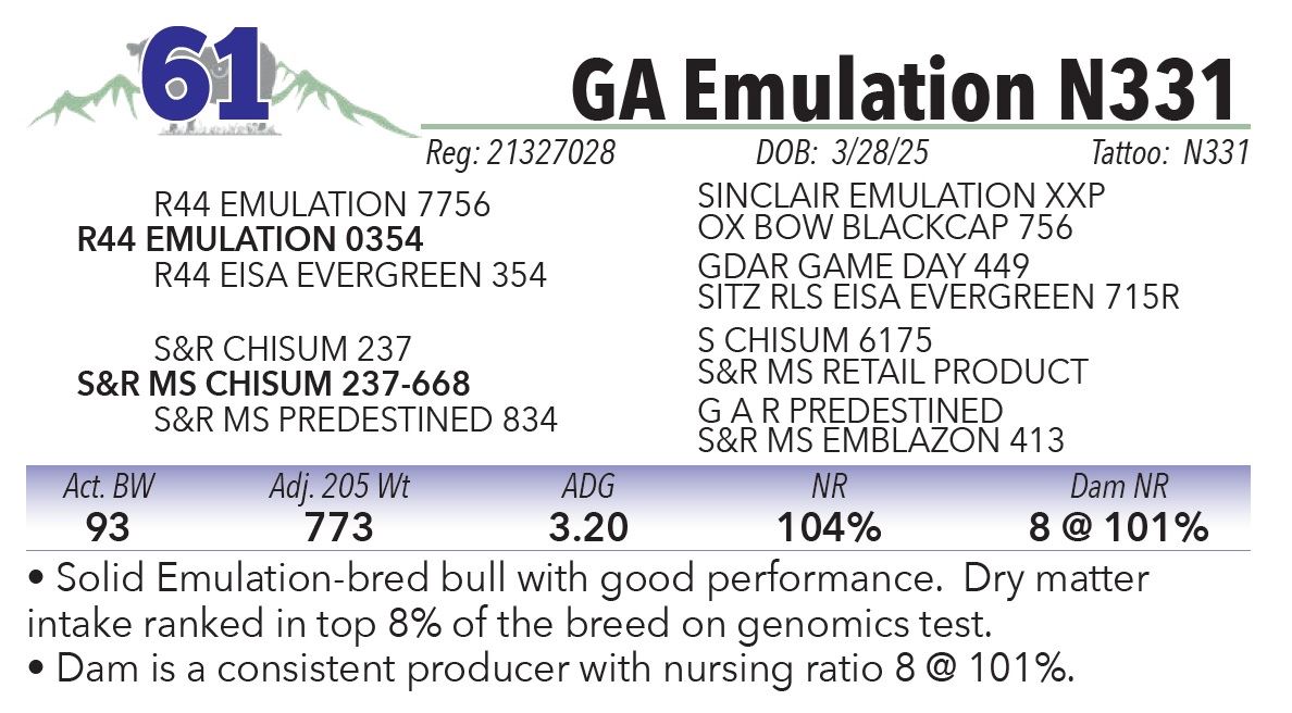 • Solid Emulation-bred bull with good performance. Dry matter