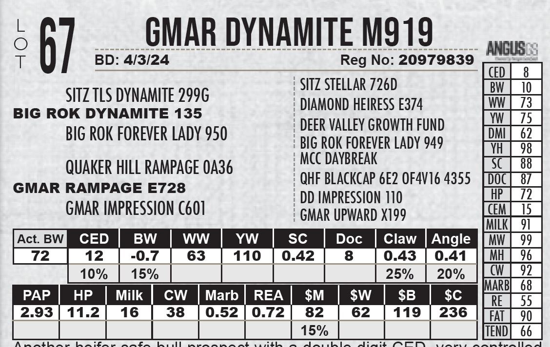 Another heifer safe bull prospect with a double digit CED, very controlled