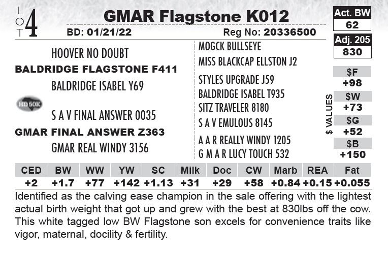 Identified as the calving ease champion in the sale offering with the lightest actual birth weight that got up and grew with the best at 830lbs off the cow. This white tagged low BW Flagstone son excels for convenience traits like vigor, maternal, docility & fertility.