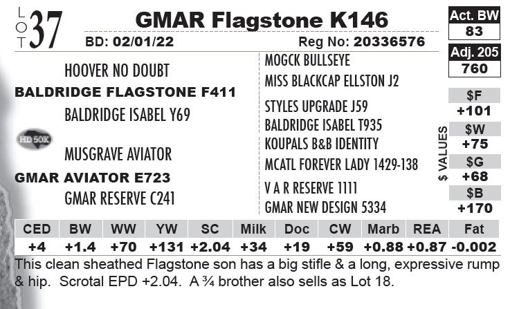 This clean sheathed Flagstone son has a big stifle & a long, expressive rump & hip. Scrotal EPD +2.04. A ¾ brother also sells as Lot 18.
