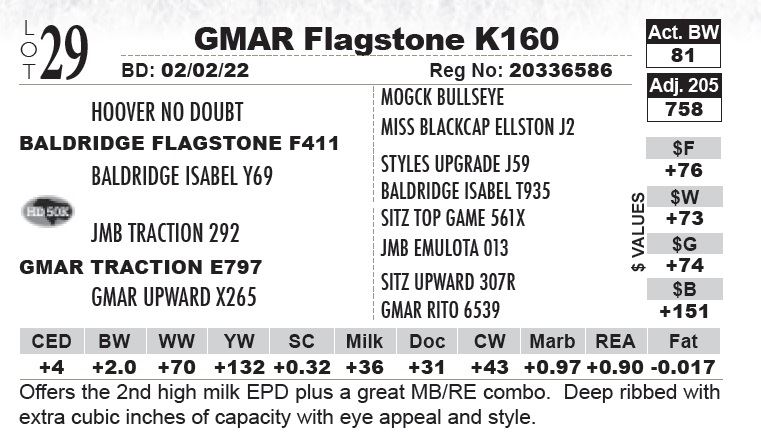 Offers the 2nd high milk EPD plus a great MB/RE combo. Deep ribbed with extra cubic inches of capacity with eye appeal and style.