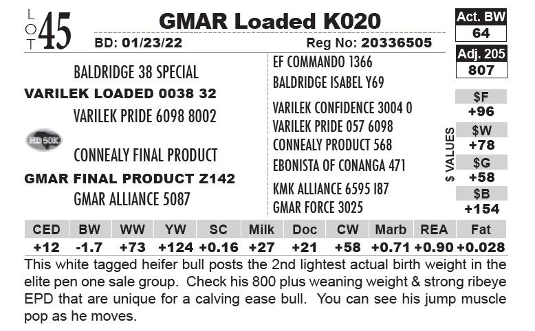 This white tagged heifer bull posts the 2nd lightest actual birth weight in the elite pen one sale group. Check his 800 plus weaning weight & strong ribeye EPD that are unique for a calving ease bull. You can see his jump muscle pop as he moves.