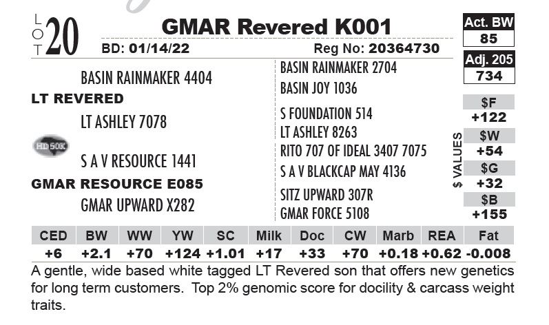 A gentle, wide based white tagged LT Revered son that offers new genetics for long term customers. Top 2% genomic score for docility & carcass weight traits.