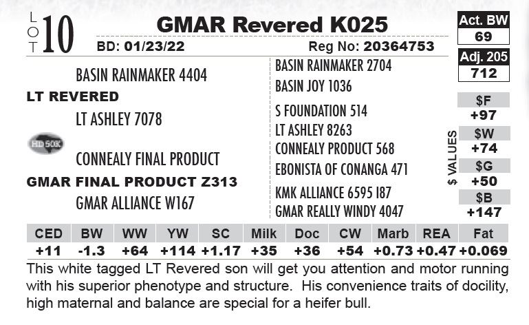 This white tagged LT Revered son will get you attention and motor running with his superior phenotype and structure. His convenience traits of docility, high maternal and balance are special for a heifer bull.