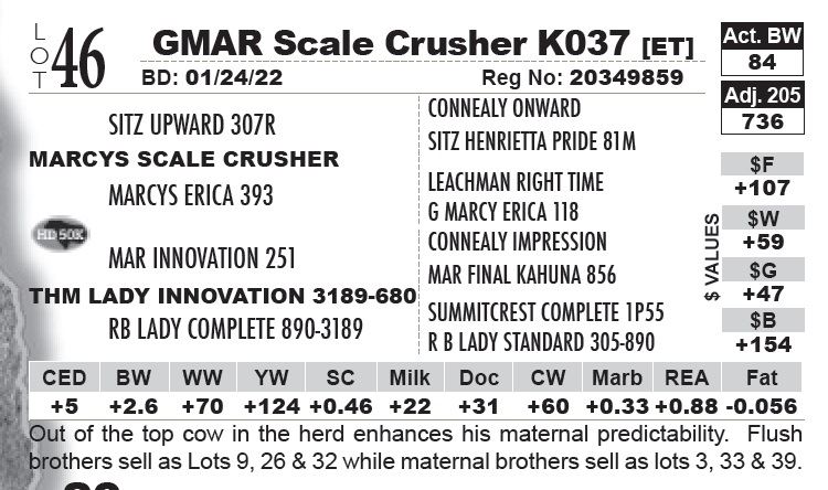 Out of the top cow in the herd enhances his maternal predictability. Flush brothers sell as Lots 9, 26 & 32 while maternal brothers sell as lots 3, 33 & 39.