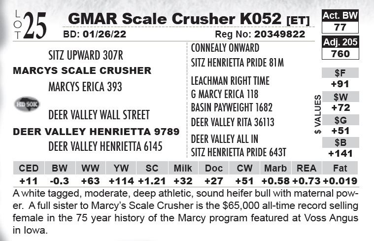 A white tagged, moderate, deep athletic, sound heifer bull with maternal power. A full sister to Marcy’s Scale Crusher is the $65,000 all-time record selling female in the 75 year history of the Marcy program featured at Voss Angus in Iowa.