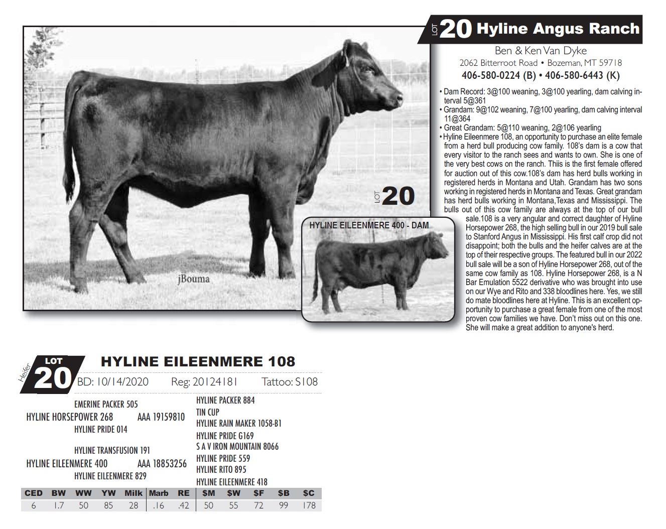 • Hyline Eileenmere 108, an opportunity to purchase an elite female from a herd bull producing cow family. 108’s dam is a cow that every visitor to the ranch sees and wants to own. She is one of the very best cows on the ranch. Thiis is the first female offered for auction out of this cow.108’s dam has herd bulls working in registered herds in Montana and Utah. Grandam has two sons working in registered herds in Montana and Texas. Great grandam has herd bulls working in Montana,Texas and Mississippi. The bulls out of this cow family are always at the top of our bull sale.108 is a very angular and correct daughter of Hyline Horsepower 268, the high selling bull in our 2019 bull sale to Stanford Angus in Mississippi. His first calf crop did not disappoint; both the bulls and the heifer calves are at the top of their respective groups. The featured bull in our 2022 bull sale will be a son of Hyline Horsepower 268, out of the same cow family as 108. Hyline Horsepower 268, is a N Bar Emulation 5522 derivative who was brought into use on our Wye and Rito and 338 bloodlines here. Yes, we still do mate bloodlines here at Hyline. This is an excellent opportunity to purchase a great female from one of the most proven cow families we have. Don’t miss out on this one. She will make a great addition to anyone's herd.